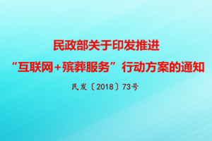 为贯彻党中央、国务院关于网络强国建设、“放管服”改革和殡葬改革等重大决策部署,按照《“互联网+民政服务”行动计划》(民发〔2018〕60号)相关要求,加快推进“互联网+殡葬服务”,推动殡葬事业健康发展,我部研究制定了《关于推进“互联网+殡葬服务”的行动方案》。现印发你们,请认真贯彻落实。