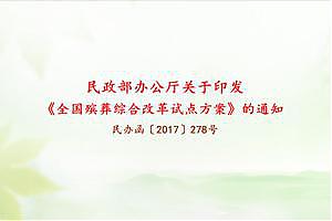 为贯彻落实《中共中央办公厅国务院办公厅关于党员干部带头推动殡葬改革的意见》,积极探索和总结成功经验做法,以点带面推动殡葬改革和殡葬事业发展,按照全国殡葬工作座谈会的部署安排,民政部决定组织开展全国殡葬综合改革试点工作。